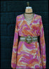 A beautiful wrap style dress, designed to compliment every body shape, they are unbelievably flattering. These wrap dresses truly give off vintage screen star vibes. Carefully pieced together for maximum contrast and impact, in the most incredible, dramatic colours. These wrap dresses are crafted from vintage 100% silk crepe, repurposed Indian sari, and each piece is one-of-a-kind, once they're gone, they are gone forever. Each colour is available in only the one size.