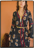 A true bohemian, 70's inspired, kaftan style maxi dress. My tailors have made perfect use of the contrasting pattern on each sari and embellished each dress down the centre front and on each sleeve. A gorgeous, sexy plunging neckline, with 3 buttons and slightly ballooned sleeves that end with an elastic cuff.