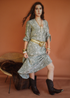A true bohemian, 70's inspired, kaftan style maxi dress. My tailors have made perfect use of the contrasting pattern on each sari and embellished each dress down the centre front and on each sleeve. A gorgeous, sexy plunging neckline, with 3 buttons and slightly ballooned sleeves that end with an elastic cuff.